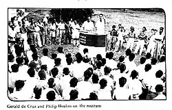According to the book written by Kamarudin Jaffar, Dr. Burhanuddin Al Helmy: Malay and Islamic politics, Dr Burhanuddin has led the Malayan delegation in this conference. The presence of Dr. Burhanuddin, who holds the position of PKMM Advisor, has opened the opportunity for him to meet and discuss movements against colonialism together with the independence leaders of Asian countries.[19] Based on the sources of information, several conclusions can be made that the flag of the Young Malay Union Association, nicknamed Sang Saka Malaya, was first designed in 1947, but its design was not the same as that carried by the participants in the Promise of Democracy.[17][18]