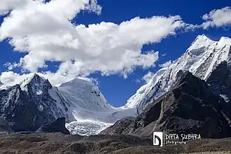![]() View from the north over the Gurudongmar glacier to the Sanglaphu, seen in the half left of the image (October 2014) | |