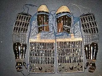 Suneate (臑当, literally shin guards) are a type of armoured shin protection worn by the samurai class and their retainers during the feudal era of Japan. Suneate first started being used in the 12th century. The suneate most commonly consisted of vertical armour plates of iron or leather connected by either hinges or mail armour (kusari), suneate could also be made almost entirely of mail. The plates were usually attached to a cloth backing which had cloth straps that were used to tie the suneate to the lower leg. There is usually a leather guard abumi-zure attached to the inner side of the place that will come into contact with the stirrup when riding. The more ancient examples of these shin-guards are seen as plates, often with rather large knee guards attached. When worn the abumi-zure of the suneate will be placed toward the inner side of the leg.[6][7][8]