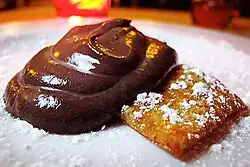 Sanguinaccio dolce ('sweet blood pudding' in English) is an Italian sweet cream based on bitter dark chocolate and pig blood, recognized as a prodotto agroalimentare tradizionale (PAT) in several Italian regions.[1][2][3][4] There are local variations in the degree to which it is served warm and runny for dipping or allowed to set and formed into a pudding or cake.[5] In Naples, it is traditionally prepared for Carnival.[6] However, public sale of pig blood was banned for health reasons in 1992.[7]