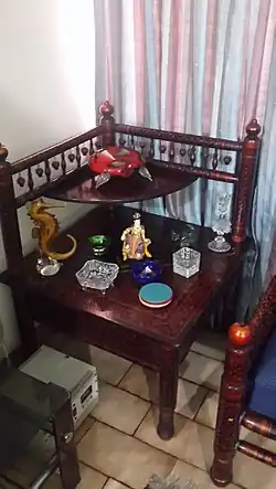 Apart from traditional furniture in a wide range of three piece settees, headboards, beds, garden swings, dressing tables, rocking chairs, tables, screens, divan, etc., [9][10] other handicraft innovations introduced in this format are wall-hangings, pedestal lamps, flower vases and pen stands, toys, kitchen ware and support for hammocks.[1] Though the design appears fragile, the furniture is durable and lasts for a long period.[9] It is a custom among the Gujarati community to gift this traditional furniture as an auspicious gift during marriage.[1]