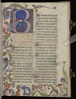 ![]() Beginning of Psalm 1, with a historiated initial "B" containing an image of King David, on folio 3 recto | |