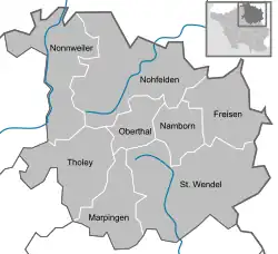 The district was created in 1834 when Prussia bought the Principality of Lichtenberg from Saxe-Coburg.[2] After World War I, the Saar area came under special rulership of the League of Nations as the Territory of the Saar Basin, and thus the Sankt Wendel district was split into two parts. The partition of the district remained in place after the Saar territory was reincorporated into Germany in 1935. In 1937 the north-eastern part, the Restkreis Sankt Wendel, was merged with the Region of Birkenfeld, formerly an exclave of Oldenburg, forming the Birkenfeld district. After World War II the Saar area was once again detached from Germany, this time as the French Saar Protectorate, which included all of the post-WWI territory plus some additional areas to the north; the eastern parts of this additional territory, most of which had come from the Birkenfeld district, were incorporated into Sankt Wendel. The Saar Protectorate was reincorporated into West Germany in 1956 as the Saarland.