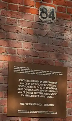 Joodse leerlingen en leerkrachten van de in dit gebouw gevestigde joodsche schoolen 10 en 11 werden in de oorlogjaren 1940 - 1945 op last van de duitse bezetter weggevoerd en keerden niet meer terug. Wij mogen hen nooit vergeten