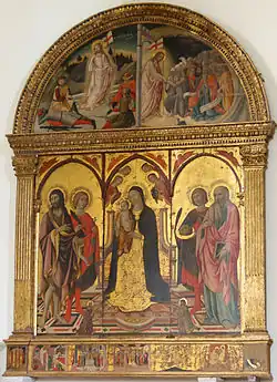 Sano was born in 1405. His name entered the roll of painters in 1428 where it remained until his death in 1481.[1] In addition to his own painting and overseeing the pupils and assistants in his workshop, Sano was part of the civic fabric of Siena; in 1431 and 1442 he was the leader of the San Donato district of Siena.[2] Sano was also employed as an arbitrator; in 1475 he was called upon to settle a dispute between fellow painters Neroccio di Bartolommeo and Francesco di Giorgio Martini.[3]