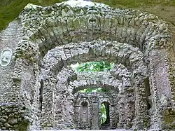 The ruined theatre in the south-eastern part of the garden is the only feature that has survived almost intact since its construction in 1744. Joseph Saint-Pierre took as his model the ruin theater in the Hermitage in Bayreuth, which he had also built a year earlier. He also drew inspiration from the only other previous example of a rock theatre, the stone theatre on the Hellbrunner Berg near Salzburg, created between 1610 and 1620.[44][1]