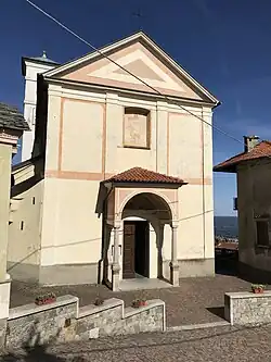 A Romanesque-style parish at the site dates to medieval times, dedicated to St Agatha. The church is documented by 1618, when it is described by the Bishop of Novara in the pastoral visit as badly done, dark, humid and low to ground. The locals are thinking of erecting one new, in a more decent and more venerable form. About sixty years later, such a project was approved by the Curia of Novara. The new church, built between 1680 and 1687, has a single nave with three arches, and four chapels along the side walls. The chapels are dedicated to the Madonna of the Rosary, the Holy Crucifix, St Joseph (later St Lucy), and St Agatha. The vault of the vestibule was frescoed in 1708 with Angels leading souls of children to Heaven. The church also has 20th-century frescoes by Giuseppe De Giorgi.[1] 45°48′28.42″N 8°30′50.97″E / 45.8078944°N 8.5141583°E