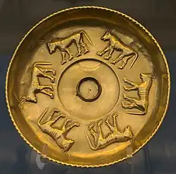 The Sant'Angelo Muxaro Patera is an ancient gold libation bowl that was discovered as part of a larger hoard in the seventeenth century near the hilltop town of Sant'Angelo Muxaro in Sicily, southern Italy. Since 1772, this rare and precious find has been part of the British Museum's Ancient Greek collection.[1]