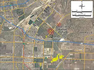 The field is within the Oxnard Plain, a rich agricultural region subject to encroachment from urban development from the cities of Oxnard, Ventura, and Camarillo. Oil production and storage equipment are surrounded by agricultural fields and orchards. Crops grown nearby include onions, broccoli, and strawberries. U.S. Highway 101 runs along the south edge of the oil field, and Santa Clara Avenue runs through it from southwest to northeast, ending at California State Route 118. The unincorporated town of El Rio is west of the field, and the unincorporated development of Nyeland Acres lies to the south, adjoining Oxnard. The total surface area of the productive part of the field is 180 acres (73 ha).[2]