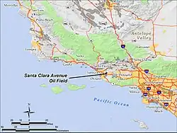 The Santa Clara Avenue Oil Field is an oil field in Ventura County, California, about six miles southeast of the city of Ventura and four miles northeast of Oxnard. It is produced entirely from two walled drilling islands along Santa Clara Avenue, each containing multiple directionally drilled wells. The field is within an agricultural area being encroached on several sides by urban development. As of 2010, the field reported 1,335,000 barrels of recoverable oil remaining and had 18 active oil wells.[1]