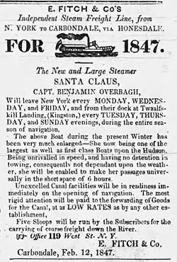Ezra Fitch, a relative of steamboat pioneer John Fitch, was a businessman from Wilbur, New York, (part of modern-day Kingston) who owned a number of canal boats and Hudson River sloops. In February 1845, his firm, E. Fitch & Company, announced its first venture into steam navigation with the proposed establishment of a regular steam service between Wilbur and New York City.[2] Fitch contracted with a New York shipbuilding firm, W. & T. Collyer, for construction of a steamboat for the service,[2] which vessel was launched on April 16.[3] Fitch had initially intended to name the steamer St. Nicholas, but when another company's steamer was so named, he decided—after briefly flirting with the alternative spelling Santa Klaas—to name his new vessel Santa Claus.[2]