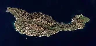 Santa Cruz Island (Spanish: Isla Santa Cruz, Chumash: Limuw[2]) is located off the southwestern coast of Ventura, California, United States. It is the largest island in California[3] and largest of the eight islands in the Channel Islands archipelago and Channel Islands National Park.[4] Forming part of the northern group of the Channel Islands, Santa Cruz is 22 miles (35 km) long and 2 to 6 miles (3 to 10 km) wide with an area of 61,764.6 acres (249.952 km2).