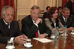 Néstor and Cristina Kirchner (center) in conference with fellow Patagonia-area lawmakers.