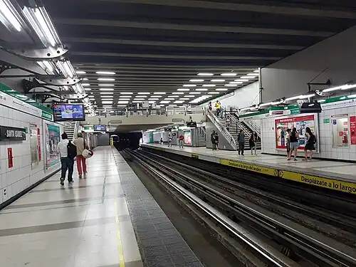 Santa Isabel is a metro station on Line 5 of the Santiago Metro, in Santiago, Chile. It takes its name from its location beneath the intersection of Avenida General Bustamante with Avenida Santa Isabel, the intersection that delineates the communes of Providencia, Ñuñoa and Santiago. The station is located underground, between the stations Parque Bustamante to the north and Irarrázaval to the south. The station was opened on 5 April 1997 as part of the inaugural section of the line, from Baquedano to Bellavista de La Florida.[3]
