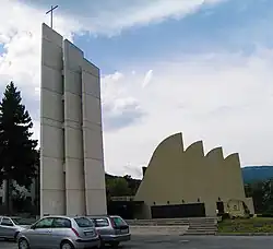 The design of the project began in 1965–66. The Archbishop of Bologna, Cardinal Giacomo Lercaro secured Aalto's participation upon seeing his work in an exhibition in Florence at the Palazzo Strozzi.[1] Lercaro had also commissioned architects Kenzo Tange and Le Corbusier to design churches in his domain.[1] Because both Aalto and Lercaro died in 1976, and only some portions of the project masterplan were completed, this work could be considered posthumous.[2] Construction began in 1975. The church was consecrated in 1978. The Campanile was completed as late as 1993.[3]