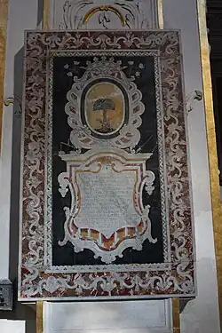 The original inscription is rich in abbreviations, here presented in full. This inscription, dating to 1776, was originally placed in the floor but was relocated to its current position after the floor was redone. The plaque is framed by a marble border and divided into two parts: at the top is the coat of arms, presumably of the family, surmounted by a crown frieze; below is the commemorative inscription in honor of Vignuzzi. Mulè Bertòlo's work, which cites information from Luciano Aurelio Barrile, Don Camillo Genovese, and Biagio Punturo, provides insights into Arcangelo Vignuzzi's life: he was born on February 28, 1715, in Caltanissetta. He studied literature and philosophy with the Jesuits, then excelled in jurisprudence in Palermo, where he settled. He held important positions, including praetorian judge in 1760 and 1761; in 1763, during a severe famine, he visited Sicilian universities as a delegate minister to assess available resources; in 1769 and 1770, he was elevated to the office of judge of the Consistory. After becoming blind, he returned to Caltanissetta, where he died on June 1, 1776, at the age of sixty-one, and this monument was dedicated to him.[8][9]