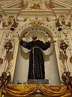 In the second chapel on the right, notable is the presence of a wooden statue of the Immaculate Conception, crafted in 1760, adorned with precious silver foil drapery.[3] In the chapel adjacent to the main one, there are representations of Saint Michael (patron of the city since the 17th century), a wooden statue by Stefano Li Volsi, and the archangels Gabriel and Raphael, marble sculptures by Vincenzo Vitaliano. On the high altar, one can admire the Immaculate Conception and Saints, a large altarpiece by Borremans. Also noteworthy are a precious carved and decorated organ, a painting of Our Lady of Mount Carmel by Filippo Paladini (1544–1614), and a crucifix once attributed to Friar Umile from Petralia (1580–1639).[4]