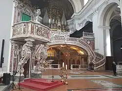 The main altar is elevated and accessed via flanking Baroque-style spiraling staircases, all sheathed in polychrome marble. The entrance to the crypt or catacombs is beneath the altar, which was elevated above the site of the original chapel at the site.[1] On the left of the nave is an elevated polychrome marble pulpit, designed by Dionisi Lazzari.[2]