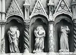 The elegant Romanesque façade has the appearance of a wall, with a central door, embellished in the 15th century, and two smaller flanking doors; each door is a round arch set into a series of archivolts, and each is surmounted by a rose window. The main decoration of the façade, however, consists in the use of contrasting stone arranged in a sort of tapestry of cruciform elements. The façade lacks any of the customary crowning gables or other superstructures and may be unfinished. An octagonal belfry, reduced to a stub after it had to be demolished following an earthquake, gives the building an asymmetrical appearance. The three portals and three rose-windows are all different. The central door was significantly reworked in the 15th century, decorated with blank niches arranged in two rows over a base composed of square panels carved with floral motifs.