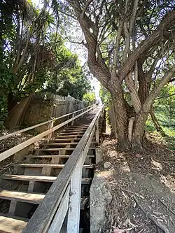The "4th-street stairway" begins at the intersection of 4th Street and Adelaide, leading down to Ocean Avenue Extension. It consists solely of concrete flights interconnected by right- and left-hand turns. There are 189 steps producing an overall vertical change of about 115 feet.[1]