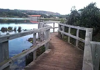 The Santa Olaja mill is a tide mill. It is one of the main attractions within the Trasmiera Ecopark, a park which was voted an EDEN destination winner in 2011.[3] The mill was constructed in the fourteenth century and remained operational until 1953. It had ten 10 wheels which gives an idea of its importance.[4] This building is a very distinctive example of sea or tidal mills, hydraulic devices prototypical of the Renaissance technological culture in Cantabria. Its operation consists of storing water during high tide in a natural reservoir enclosed by dams, which is later used to activate the other mechanisms.[2]
