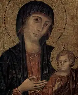 The Santa Trinita Maestà (Italian: Maestà di Santa Trinita) is a panel painting by the Italian medieval artist Cimabue, dating to c. 1288-1292. Originally painted for the church of Santa Trinita, Florence, where it remained until 1471, it is now in the Uffizi Gallery of Florence, Italy. It represents the Madonna enthroned with the Baby Jesus and surrounded by eight angels and, below, four half portraits of prophets.