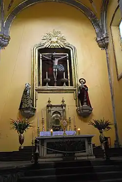 In the apse, in a simple niche, is the Christ of the Seven Veils, done in cornstalk paste in the 16th century, accompanied by images of the Virgin of the Sorrows and John the Baptist.[2] According to tradition, it was given to Carlos V from Pope Paul III. Carlos V then awarded it to the Brotherhood. It was also believed that those permitted to remove the veils and see the image underneath were rewarded with indulgences. Another important image here is the Virgin of the Remedies (Virgen de los Remedios), which is also known as La Gachupina. Gachupin is a derogatory term for Spaniard. She received the term as she was the patron of the Spanish in Mexico.[1] The Virgin originally had her own sanctuary but was brought here to ask for rain during a dry period, and never left.[2]