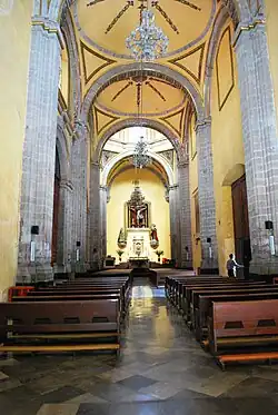 The building has one nave, with a layout of a Latin cross. The nave is covered in vaults of several different types with some containing images of cherubs done in relief. The cupola has eight sides and a raised area with windows (linternilla).[2][1] The main nave contains the painting Virgin of Guadalupe before the Holy Trinity from the 18th century, and three works from the 19th century called The Baptism of Jesus, The Divine Providence, and The Virgin at the Foot of the Cross. There are also images of the Sacred Heart of Jesus, the Virgin Mary, and Saint Blas. In the south bell tower there is a dramatic image of Christ the Nazarene which is dated to the 18th century.[2]