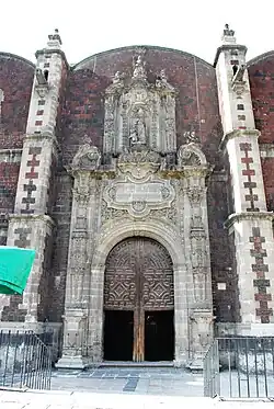 The building has facades on the west, south and east sides, with the south façade, facing Hidalgo Street, as the main one.[3] These facades are covered in tezontle and gray sandstone (cantera) with two elaborately decorated Mexican Baroque or Churrigueresque portals.[1] The portal on the main facade has two levels, with entrance through a rounded arch flanked by pilasters with inverted, elongated, truncated pyramid shapes called estipites. The second level has two pairs of estipites, with a simple cross, a large choral window, and three pyramid-shaped pinnacles. At the top of the façade is a sculpture of Saint Joseph. The side portal is richer than the main one.