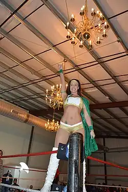 On October 16, 2015, Garrett made her debut for Japanese promotion World Wonder Ring Stardom, during their first American tour in Covina, California. She teamed with Melina in a tag team match, where they defeated Hudson Envy and Thunder Rosa.[49] On October 25, Garrett made her Japanese debut for Stardom, when she and Hiroyo Matsumoto defeated Goddess of Stardom Champions Io Shirai and Mayu Iwatani in a non-title match.[50] Also on October 25, at Mask Fiesta 2015, Santana Garrett, under the ring name Santana Wonder, teamed up with Lucky Blanca to defeat Crazy Wolf and Datura.[51][52] On November 8, Garrett and Matsumoto took part in the 2015 Goddesses of Stardom Tag League, where they made it to the finals, before losing to Shirai and Iwatani in a match, which was also contested for the Goddess of Stardom Championship.[53] On November 15, Garrett successfully defended the NWA World Women's Championship against Holidead, which marked the first time in 36 years that the title had been defended in Japan.[54] On November 23, Garrett defeated Io Shirai in a double title match to retain the NWA World Women's Championship and win the Wonder of Stardom Championship.[55] After nine successful defenses, Garrett lost the title to Kairi Hojo on May 15, 2016.[56] On May 21, Garrett took part in a tournament to crown the inaugural SWA World Champion, where she was defeated by Toni Storm in the semifinals.[57]