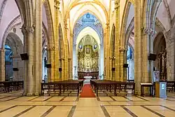 The presbytery is surrounded by the ambulatory, which contains two altars devoted to Saint Fernando III of Castile and to Saint Matthias. It is also accompanied by a piece of marble with carvings in Arabic, supposedly taken in the assault on Seville. In the southern flank there is a tribune decorated by José Cataluña. The vaults are simple groin vaults, whose slenderness is magnified by the light coming from the clerestory in the wider and higher central nave.