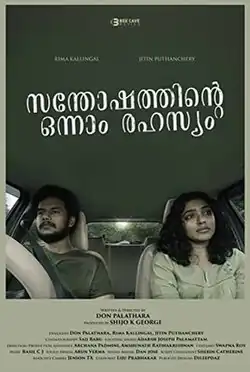 Santhoshathinte Onnam Rahasyam (English: The First Joyful Mystery) is a 2021 Malayalam film directed by Don Palathara starring Jitin Puthenchery and Rima Kallingal.[1] The film was premiered at the International Film Festival of Kerala (IFFK) in Thiruvananthapuram on 21 February 2021. This is a first of its kind experimental movie in Malayalam film industry as the entire movie is of an 85 minute single shot.[2][3] The film follows a car ride taken by a young journalist (played by Rima) and an aspiring actor (played by Jitin). The film was released in Neestream and six other OTT Platforms in July 2021.[4]