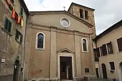 A church at the site, dedicated to Saints Michael and Paul, is documented from the 13th century. The Archangel Michael, patron saint of high and inaccessible places, was patron of the town since 1540. Built inside the medieval walls, the present church was built in the 14th century. The church houses an organ from 1604, a 16th-century altarpiece depicting St Sebastian, and a small canvas depicting the Madonna della Cintola, (Madonna of the Girdle), attributed to Taddeo Gaddi. The urn above the main altar contains the relics of the Blessed Giacomo Papocchi. The reliquary bust dates to 1670.[1]