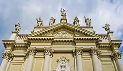 Originally a church was found at approximately the same site in 1222, in an area that was soon enclosed by enlarged city walls. A major reconstruction began in 1746, by designs of abate Zinelli, and completed in 1781, leading to the statue-topped neoclassical facade we see today.[1] It was interrupted in 1769 by an accidental explosion of a powder magazine at nearby Porta Nazaro. Reconstruction finally ceased and worship was resumed in 1780. Seventeen years later the college of canons was suppressed, but the church remained functioning as a parish church. The organ in the church was completed by Luigi Amati in 1803.