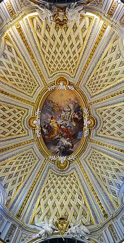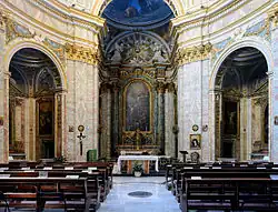 The high altarpiece of 'The Most Holy Trinity and the freeing of a slave' is by Corrado Giaquinto. Above it are two smaller works by Antonio González Velázquez showing 'Abraham and the three angels' and 'Abraham and Sarah'. The main ceiling painting shows Saint John of Matha in glory (Gregorio Guglielmi) and those in the side chapels are by Andrea Casali.