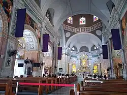 The structural envelope is characterized by minimal ornamentation with Ionic rectangular pilasters attached at the main facade. Massive buttresses also support the unproportional domes of the bell towers. There are also blind arched openings that contrast with the rectangular voids and a triangular pediment. The neoclassical architectural style has its big influence the construction of the church and convent. In its interiors, it is composed of a main central nave that is flanked by two aisles that are linked by solid columns. The internal space spans 65 metres (213 ft) in length, 22 metres (72 ft) in width and 17 metres (56 ft) in height.[5]