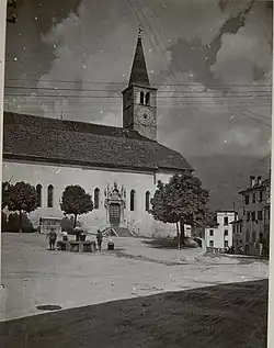 The piazza in front, once displayed a sarcophagus of a Roman cavalry officer, Caius Flavius Hostilius found under the choir of the present church.[1] The sarcophagus is now on display in the civic museum of Palazzo Crepadona.