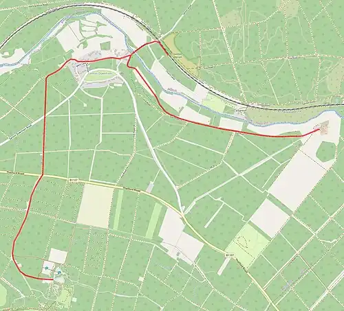 The forest railway had a track gauge of 3 ft (914 mm). The 3.5 kilometres (2.2 mi) long main line ran from the sawmill on the Cambridge-Norwich standard gauge railway line to the High Lodge and a 2.5 kilometres (1.6 mi) long branch line to Little Lodge Farm.[4] The line is not shown on historical maps, so that there are four different theories about its course.[4][5]
