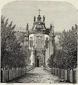 In 1861, a side chapel attached to the main structure was built on the right side of the apse to venerate Nosso Senhor dos Passos.[17] The bell towers were not present in André Soares' drawings. According to many engravings of that time, including a lithograph drawing by George Vivian,[33] the initial appearance of the church façade was more open, making the central section stand out, enhancing the dynamic scenic effect of the wall's undulation.[22] In 28 May 1862, the construction of the bell towers was initiated,[4] a project led by Porto's architect Pedro Ferreira.[17]