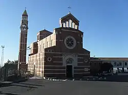 A smaller church had been built at this site to honor a putative apparition in 1580 of the Virgin Mary to a young woman tending her goats in the field. Called the chapel of Santa Maria del Pietoso; in 1616, the named was changed to Maria SS. della Consolazione. In 1935, the church was made into a sanctuary by the archbishop of Catania. During World War II, the former church was nearly razed by bombardments. The present church, in a neo-Romanesque style, was not completed until 1954 under the patronage of Michelangelo Virgillito.[1] The design of the present church was by the engineer Rosario La Russa. The interior has frescoes, painted against a Byzantine style gilded background, by Archimede Cirinnà.[2] Other frescoes in church were by Antonio Majocchi.