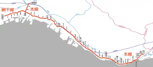 - Main Line: Nishidai Station (Kobe) – Shikama Station – Sanyo-Himeji Station (54.7 km)