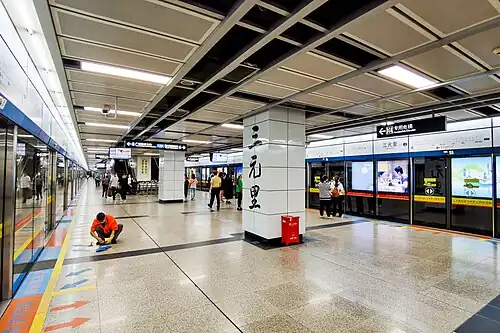 Sanyuanli Station (Chinese: 三元里站; Jyutping: saam1 jyun4 lei2 zaam6; Cantonese Yale: Sāam'yùhnléi Jaahm) is a metro station of Line 2 of the Guangzhou Metro. It started operations on the 29th of December, 2002. It is located at Sanyuanli in Baiyun District. It is adjacent to the Sanyuanli Anti-British Resistance Monument (三元里抗英纪念碑), Sanyuanli Coach Terminal (三元里客运站), Guangzhou Airport Expressway (广州机场高速公路) and Jingzhu Expressway.[1][2]