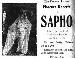 Sapho is a lost[1] 1913 silent film feature drama directed by Lucius Henderson and is based on the novel by Alphonse Daudet and its stage adaptation by Daudet and Adolphe Belot. It stars stage actress Florence Roberts and Shelley Hull.[2][3] It was produced by the Majestic Motion Picture Company and released by World's Special Films. As with Queen Elizabeth (1912) and Resurrection (1912), the film was one of the first features to star a major actress known by name. It competed with a four-reel French film that same year, 1913.[4]