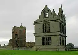 Moreton Corbet Castle, Corbet's seat, was repeatedly damaged during the Civil War[34] as it was one of the contested strongpoints between Wem and Shrewsbury. However, Corbet was not at home when it fell to Wem's small garrison in September 1644. The operation was led by William Reinking, a Dutch professional soldier retained by the Parliamentarians.[35] Mounting one of the fortifications by surprise, five determined attackers made as much noise and confusion as possible, hurling hand grenades at the defenders to pen them indoors and convince them that a large force had broken in. The castle fell, with the loss of only one Parliamentarian and a huge quantity of arms and ammunition was taken.