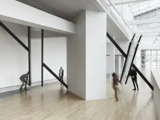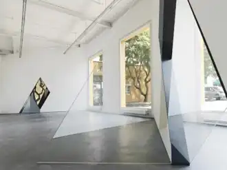 In D-33 (P.P.O.W., 2012) and 33-D (Kunsthaus Baselland, 2014), Oppenheimer modified the boundary between three contiguous rooms, inserting a pair of slanting openings at the spaces' corners.[3][31][7][32] The openings united, separated and altered the interconnected environments, offering shifting views and light conditions. Edged with bands of dark, matte aluminum cladding, they recalled the drawn lines and shapes of hard-edge geometric abstraction.[3][7][32] The New York Times's Roberta Smith described D-33 as "a new variation on the empty-gallery-as-art," which combined graphic punch and Caligari-esque Expressionism to torque space "in ways both apparent and mysterious."[31] W-120301 (Baltimore Museum of Art, 2012) was Oppenheimer's first permanent work in a museum.[6][19] It involved three precise, four-sided cutouts—in the ceiling of a second-floor gallery, in the wall of a third-floor gallery, and in the wall of an adjacent rotunda—that formed a Y-like shape opening into a volume embedded within the floors and walls.[2][33] She arranged the aperture to create unexpected "shortcut" views of spaces located within a few feet of one another, but experientially remote.[2][6][4]