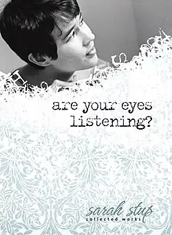 In 2007, Stup published Are Your Eyes Listening? Collected Works, which is a collection of poetry and essays about her experiences with autism.[1][4][5] In 2008, she began publishing Sarah's Keepsake Collection, a set of gift books with themes that include life, love, family, and nature,[1] titled Nest Feathers and Heart and Spirit.[3]