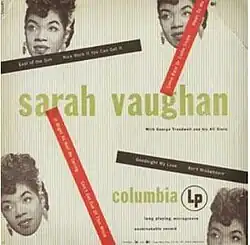 Sarah Vaughan is the debut 1950 LP album of Sarah Vaughan with George Treadwell and His All Stars, 10" Columbia Records CL 6133. The instrumentalists comprised Billy Taylor Sr. bass, clarinet Tony Scott, drums J.C. Heard, guitars Freddie Green and Mundell Lowe, piano Jimmy Jones, on tenor saxophone Budd Johnson, trombone Bennie Green, and trumpet Miles Davis.[1] The 8 songs were later incorporated into 1955's Sarah Vaughan in Hi-Fi.