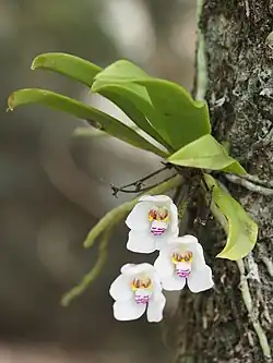 Sarcochilus falcatus, commonly known as the orange blossom orchid,[3] is a small epiphytic or lithophytic orchid that is endemic to eastern Australia. It has up to eight, leathery leaves with fine teeth on the edges and up to twelve white to cream-coloured flowers with a white labellum that has orange and purple markings.