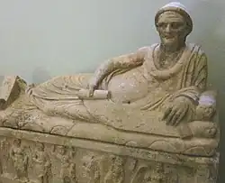 The Sarcophagus of Laris Pulenas, also known as "The Magistrate," dates from the 2nd or 3rd century BCE. It was discovered in Tarquinia in Italy and is now in the Tarquinia National Museum.[1] It features a reclining figure, Laris Pulenas, before whom is a stone carving of a long strip of cloth (volumen), half-unrolled, inscribed with one of the longer continuous inscriptions in Etruscan (Corpus Inscriptionum Etruscarum, n.5430), nearly 60 words, making it of particular linguistic value.[2]