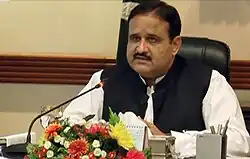 Sardar Usman Ahmed Khan Buzdar (Urdu: عثمان بزدار; born 1 May 1969[1]) is a Pakistani politician who was Chief Minister of Punjab from 20 August 2018 to 30 April 2022. Buzdar was a member of the Provincial Assembly of Punjab from August 2018 till January 2023 representing the Pakistan Tehreek-e-Insaf (PTI). Belonging from a Baloch family, he is a minor feudal and the Tumandar of the Baloch tribe Buzdar, since April 2019. He served as Tehsil Nazim of Tehsil Tribal Area from 2001 to 2008.